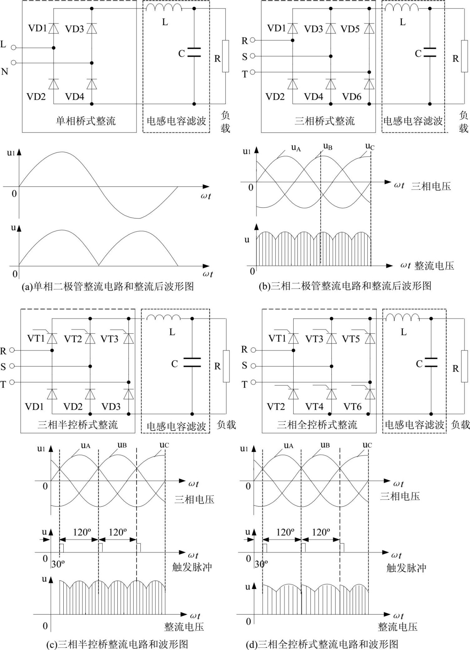 在图2-10中有单相二极管桥式整流滤波电路、三相二极管桥式整流滤波电路、三相半控桥式整流滤波电路以及三相全控桥式整流滤波电路。