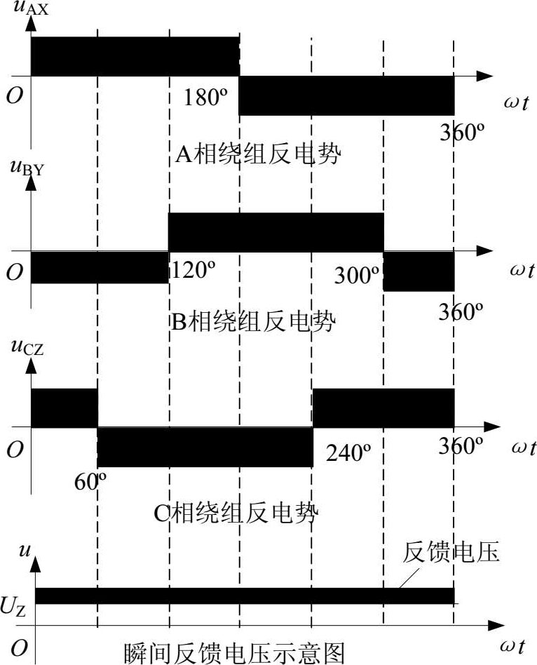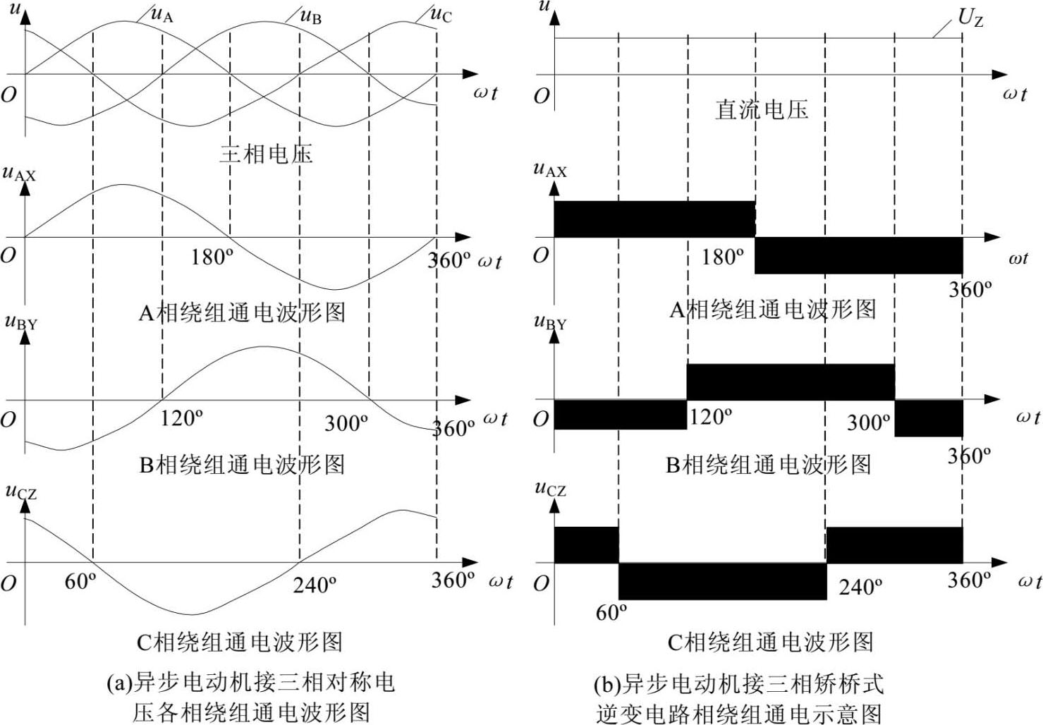 图2-16 三相绕组接三相对称电压各相绕组通电波形和三相绕组接逆变电路各绕组通电对比图