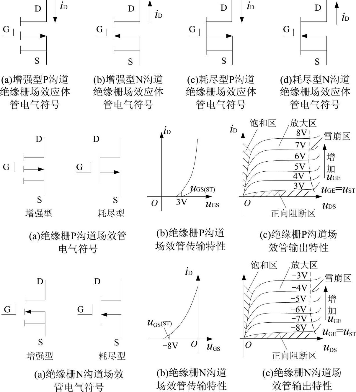 图2-9 绝缘栅增强型和耗尽型P沟道和N沟道场效应管电气符号和特性曲线