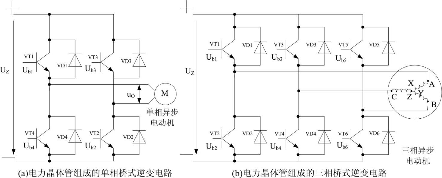 图2-12所示给岀了用电力晶体管组成的单相桥式逆变电路和三相桥式逆变电路原理图,图2-13所示给岀了用绝缘栅双极型晶体管组成的单相桥式逆变电路和三相桥式逆变电路原理图。