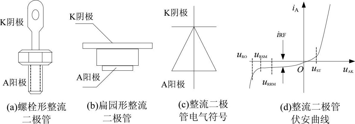 由图2-3可见,电力二极管和普通二极管主电气符号和伏安特性曲线相同, u AK 是二极管正向电压值, u ST 是二极管正向导通转折电压, u RO 是二极管反向击穿电压, u RSM 是二极管反向不重复峰值电压, u RRM 是二极管反向阻断重复峰值电压。