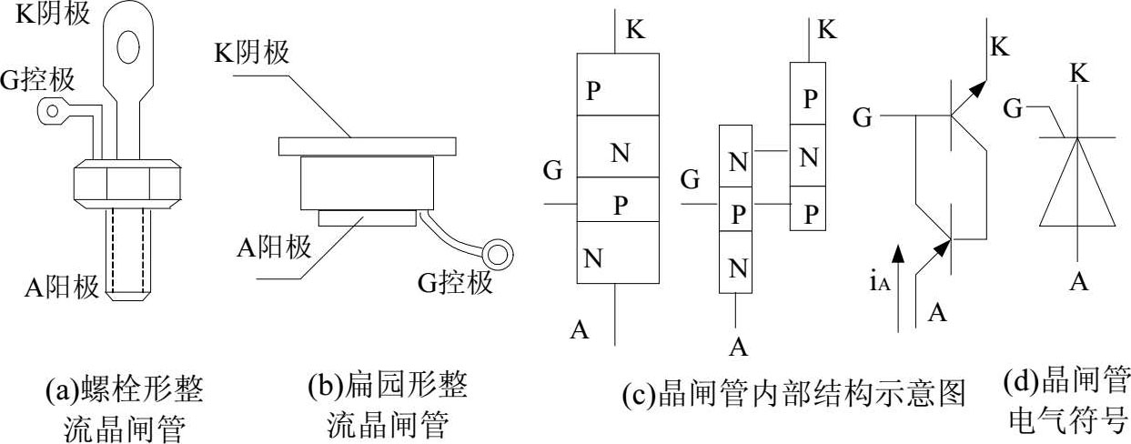 图2-4 普通整流电路用晶闸管外形图和内部结构及电气符号图