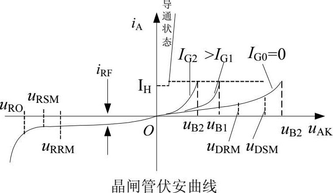 在图2-5中的 u AK 是晶闸管正向电压值, u DSM 是晶闸管在 I G =0时正向导通转折电压, u DSM 是晶闸管在 I G =0时正向不重复峰值电压, u DRM是晶闸管在 I G =0时正向重复峰值电压, u RO 是晶闸管反向击穿电压, u RSM 是反向不重复峰值电压, u RRM 是反向阻断重复峰值电压, I H 是晶闸管正向导通维持电流(晶闸管正向导通电流 I A 小于维持电流 I H ,会使晶闸管关断)。