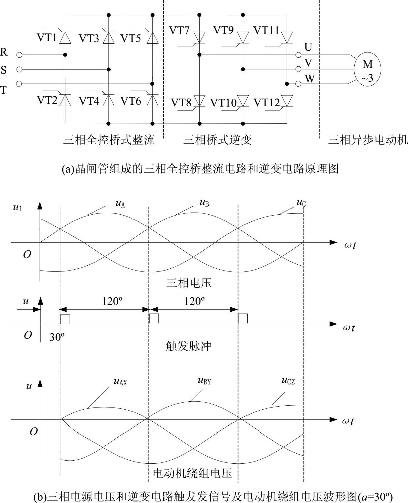 图2-25 用晶闸管组成的三相全控桥整流电路和三相桥逆电变路和电压波形图