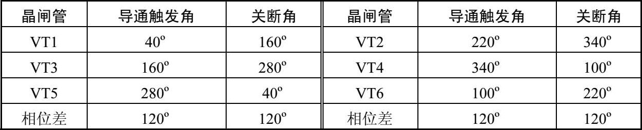 由表可知,逆变桥路中每个桥臂的两支门极晶闸管导通触触发角之间相差180°电角度,两支门极晶闸管关断角之间也相差180°电角度。VT1和VT2组成的桥臂与VT3和VT4组成的桥臂与VT5和VT6组成的桥臂,三支桥臂中的VT1、VT3、VT5之间的导通触发角相位差120°电角度,关断角之间也相差120°电角度;VT2、VT4、VT6之间的导通触发角相位差120°电角度,关断角之间也相差120°电角度。