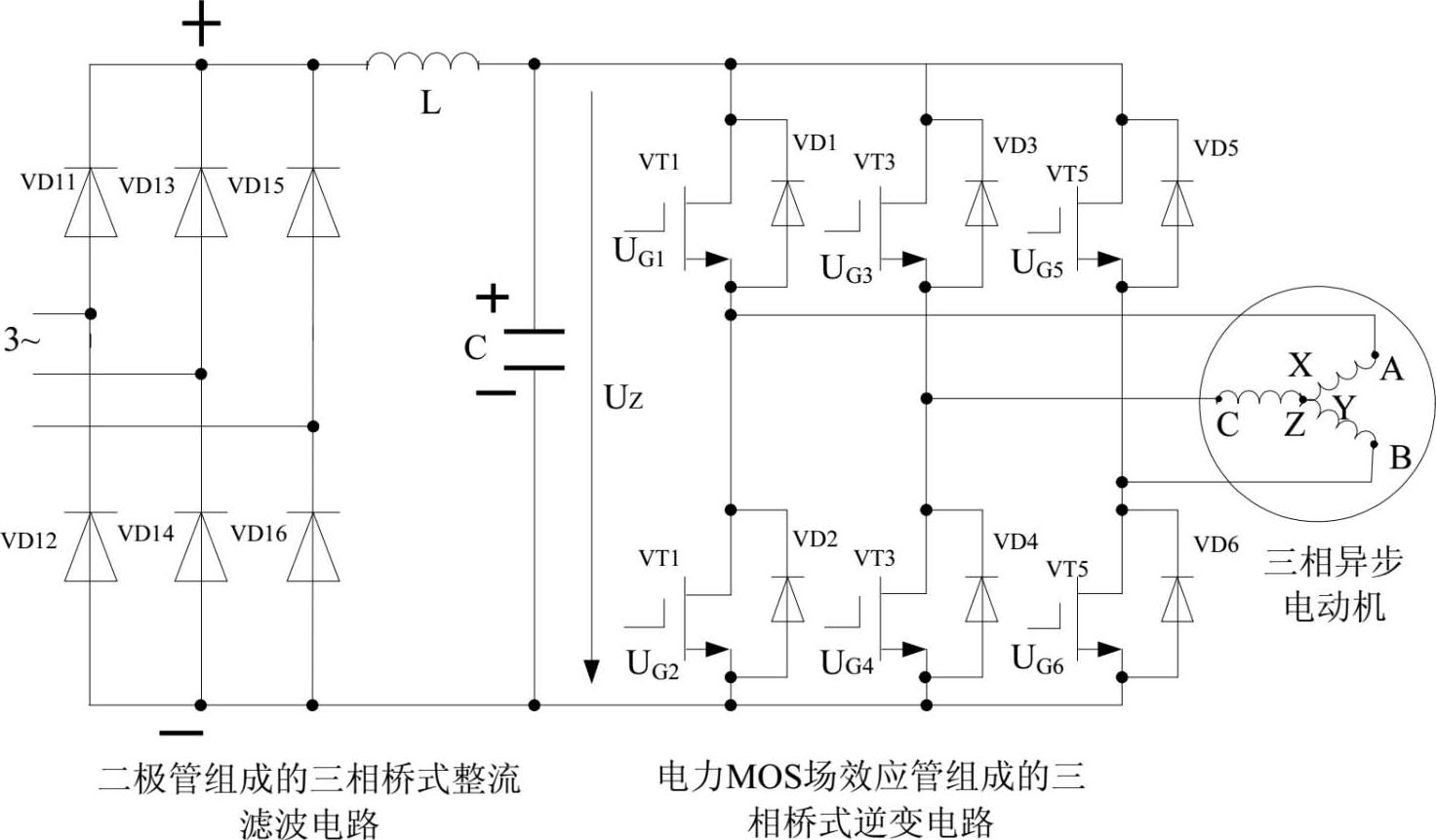 图2-26 用二极管组成三相整流滤波电路和电力MOS场效应管组成的桥式逆变电路