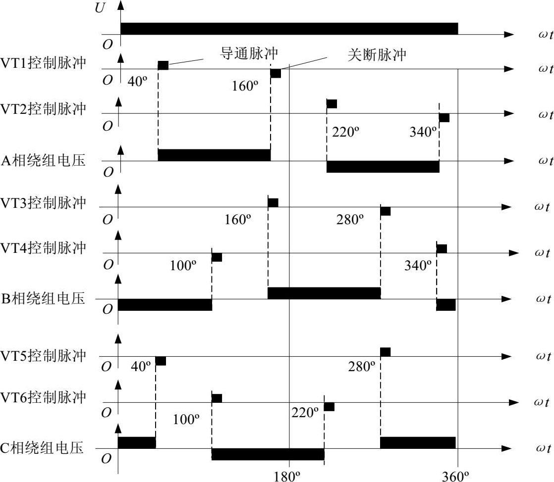 由图2-16可知,若要使三相异步电动机接三相桥式逆变桥路工作状态与其接三相正弦交流电压工作状态相类同,就需要VT1、VT3、VT5、VT2、VT4、VT6六支晶体三极管有规律的导通与关断,具体导通与关断顺序如下(一个周期)。