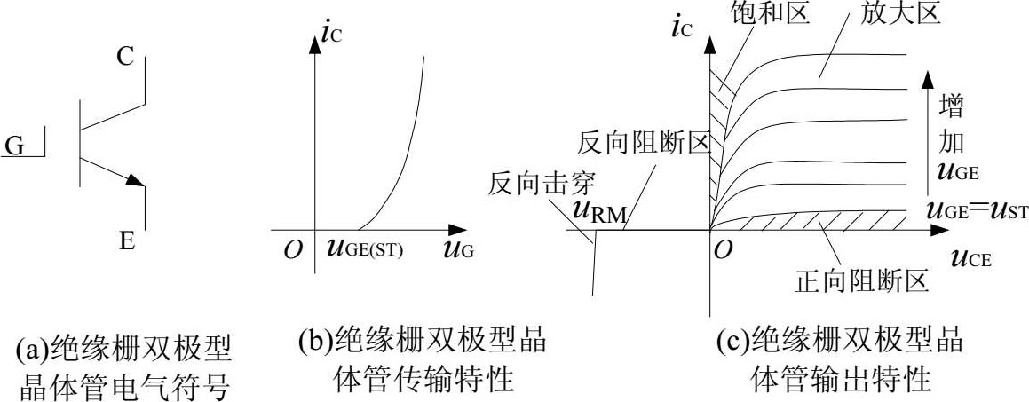 在图2-7(b)中绝缘栅双极型晶体管传输特性曲线有开起电压 u GE (ST),即 u GE > u GE (ST)时 I C 突然增大。绝缘栅双极型晶体管输岀特性曲线正向分为3个区,即正向阻断区、饱和区、放大区;反向分为反向阻断区和反向击穿区。绝缘栅双极型晶体管工作在正向饱和和正向阻断区,称为工作在开关状态。