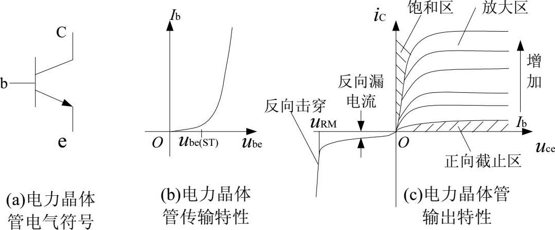 在图2-6(b)中电力晶体管输入特性曲线有开起电压 u be (ST),即 u be > u be (ST)时 I b 突然增大。电力晶体管输入特性曲线正向分为三个区,即正向截止区、饱和区、放大区;反向分为反向漏电区和反向击穿区。电力晶体管工作在正向饱和和截止区,称为工作在开关状态。
