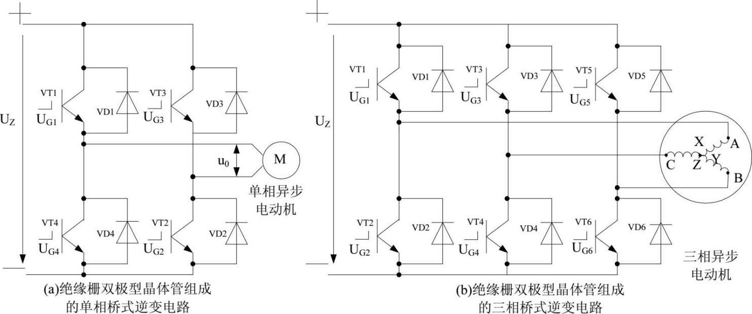 在此先介绍用电力晶体管和绝缘栅双极型晶体管组成的逆变器。电力晶体管和绝缘栅双极型晶体管有类同的导电原理;电力晶体管是基极电流控制的元件,绝缘栅双极型晶体管是栅极电压控制的元件。