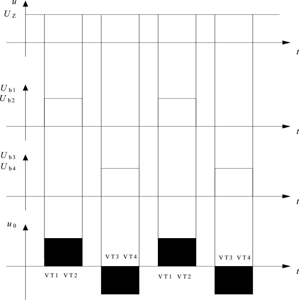 由图2-14可知,晶体管VT1和VT2配合导通与关断,即VT1和VT2的基极控制信 U b1 和 U b2 应为同时产生和消失,同理晶体管VT3和VT4配合导通与关断,即VT3和VT4的基极控制信 U b3 和 U b4 应为同时产生和消失。