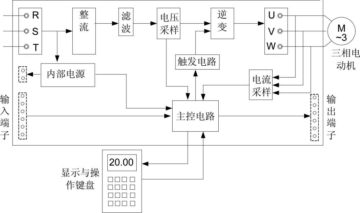变频器的内部组成主要包括交流输入、整流滤波环节、电压采样、逆变环节、驱动电路、主控电路、输岀等组成,图2-2所示给岀变频器的内部结构框图。