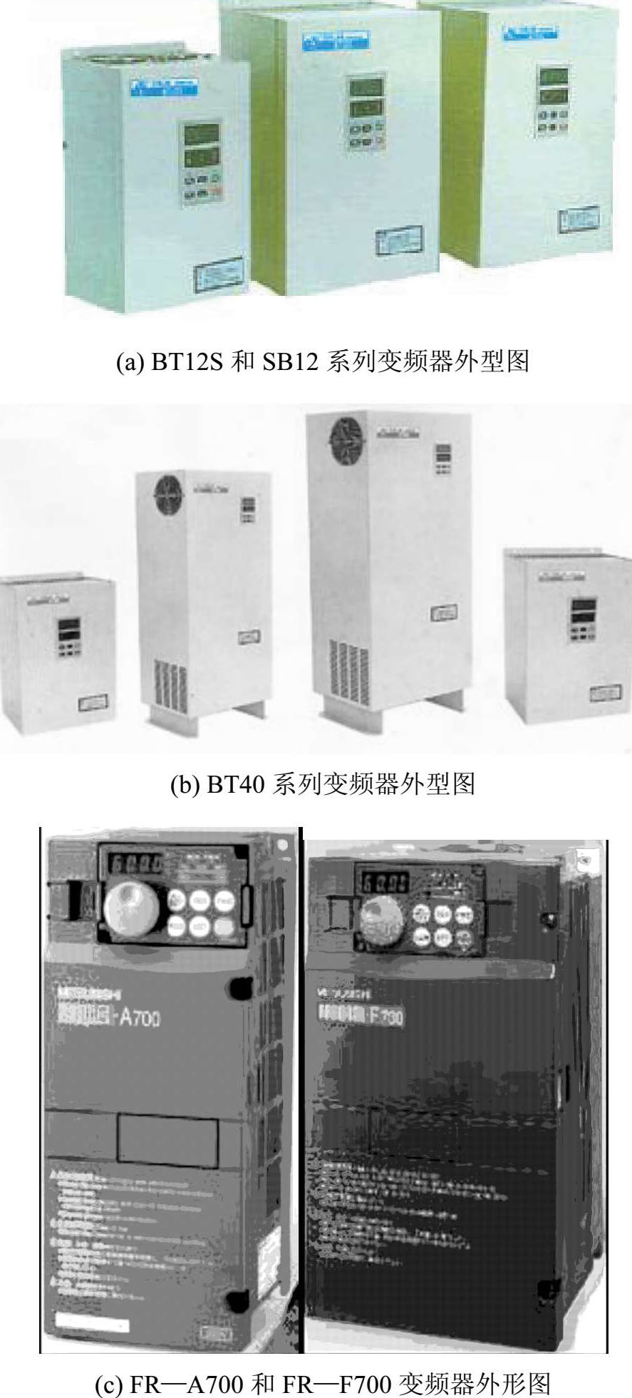 调速用变频器种类很多,型号各异,但其结构和工作原理基本类同,操作面板和参数设定有差。在此仅给出BT12S、SB12、BT40、FR-700系列变频器外观图如图2-1所示,并简单说明变频器的安装方式,有关变频器的参数设置和操作将在第3章介绍。