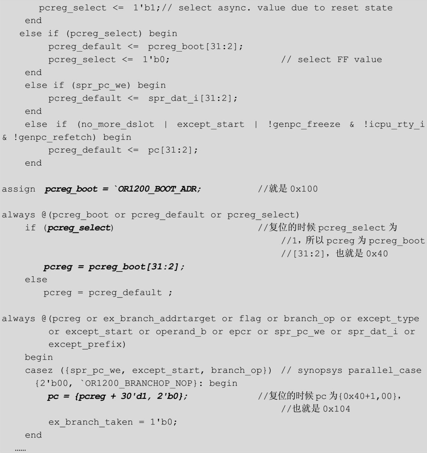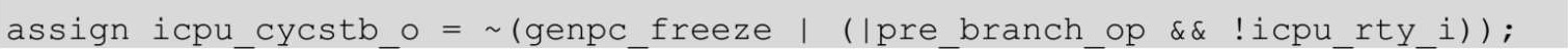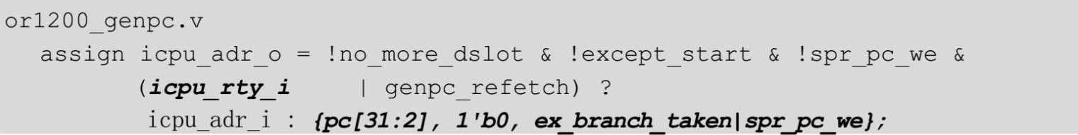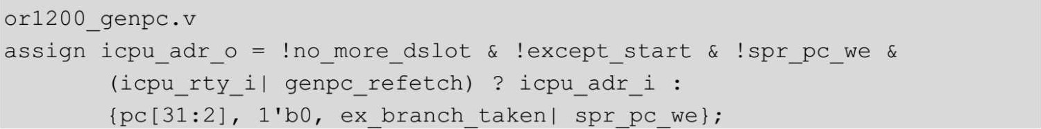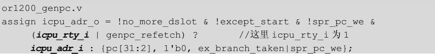 参考3.5.1节中的内容,此时pcreg变为0x40,pc还是0x104,icpu_rty_o为0,不考虑ex_branch_taken、spr_pc_we,认为两者都是0,所以icpu_adr_o变为pc的值,代码如下。