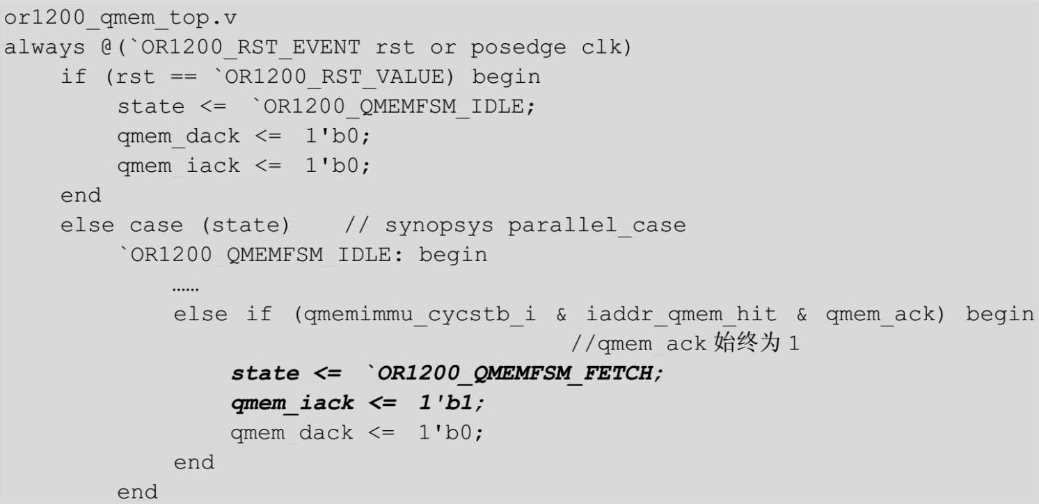在QMEM中的变量state会变为OR1200_QMEMFSM_FETCH,同时qmem_icak为1。