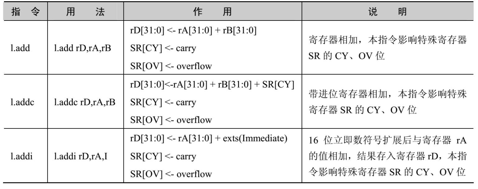 笔者对数据处理类指令的分类有48条,表4.1给出了OR1200中实现的所有算术处理类指令及其说明。
