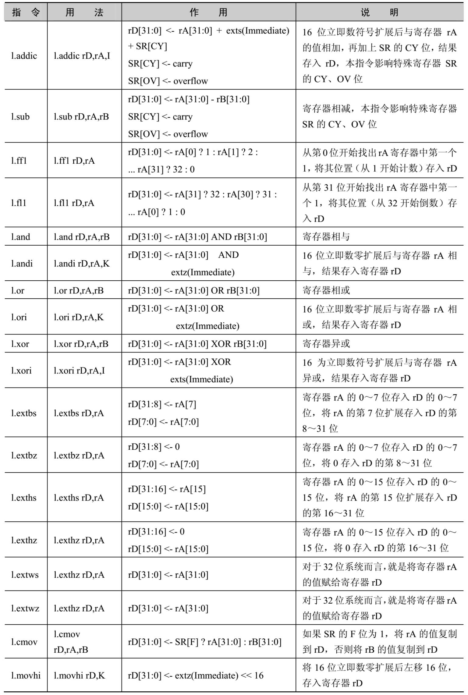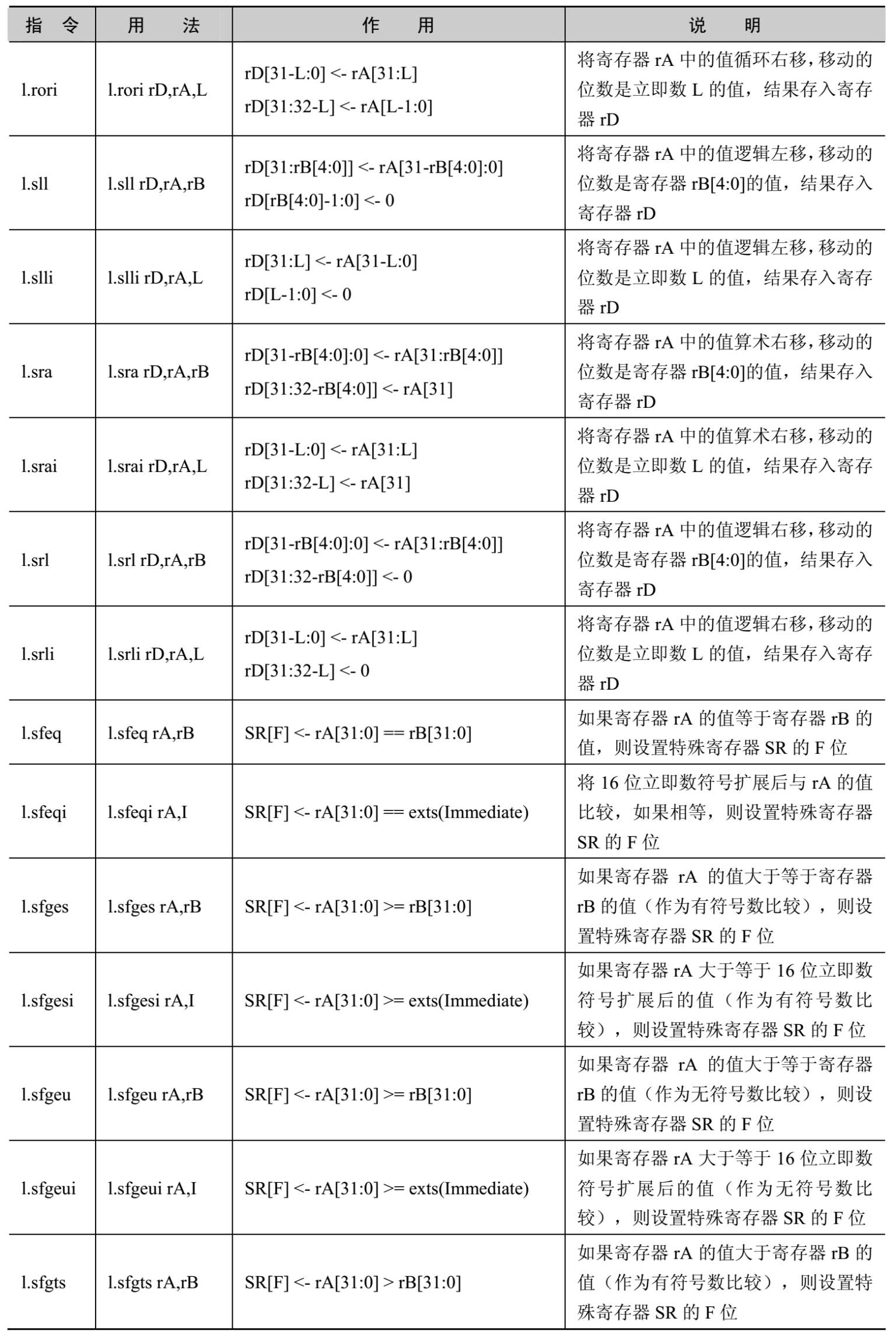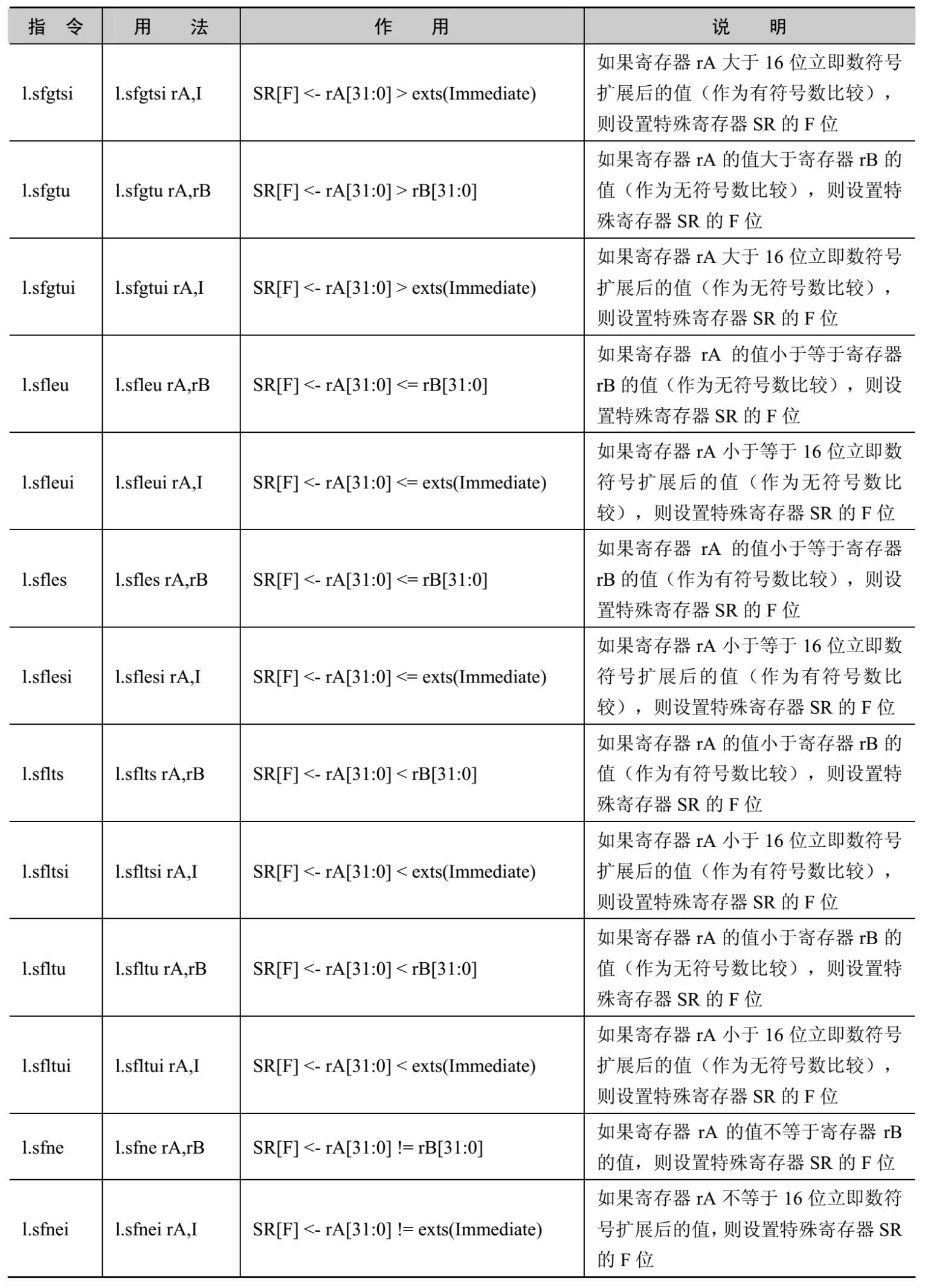 上述指令助记符也是很好理解的,比如有很多的比较指令,这些指令的助记符都是以“l.sf”开始,其中“l.”表示指令是基本指令集ORBIS32中的指令,“sf”代表“set flag”,因为比较指令都要通过设置SR寄存器的F位以表示比较结果,比较指令助记符的最后一个或两个字母有如下几种情况。