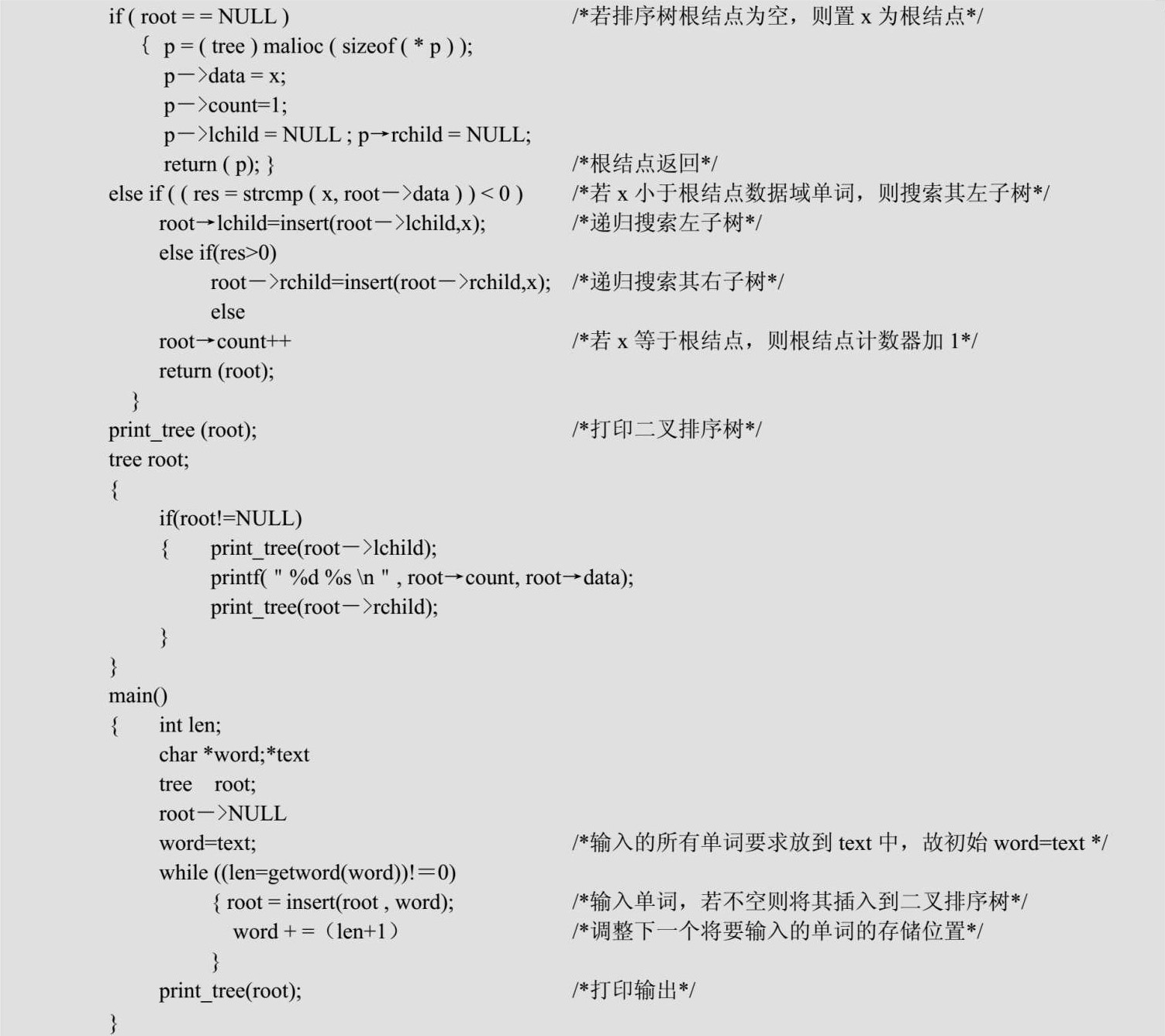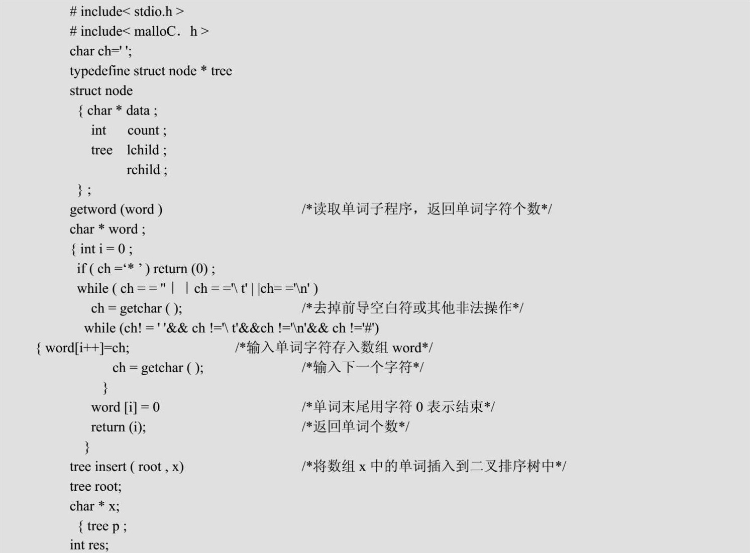 为了使存储空间使用更加合理且能够处理任意长度的单词,程序设立了一个数组text,所有读入的单词都放在 text 数组中。函数getword 完成读入单词的操作,并返回所读入单词的长度。函数insert 完成在二叉排序树中插入一个新结点的操作并返回指向二叉树根结点的指针。