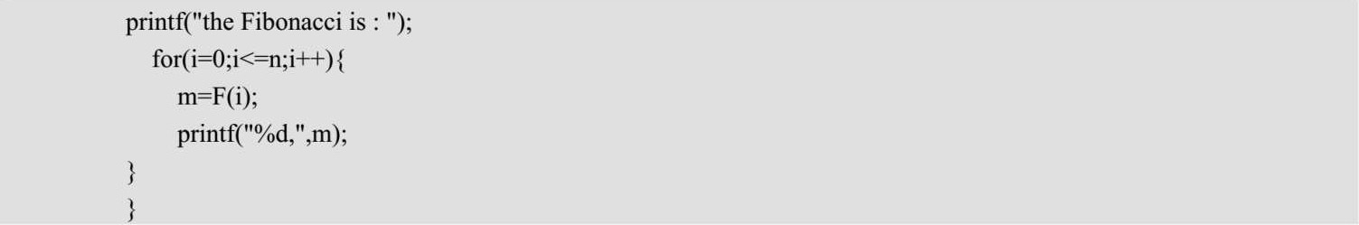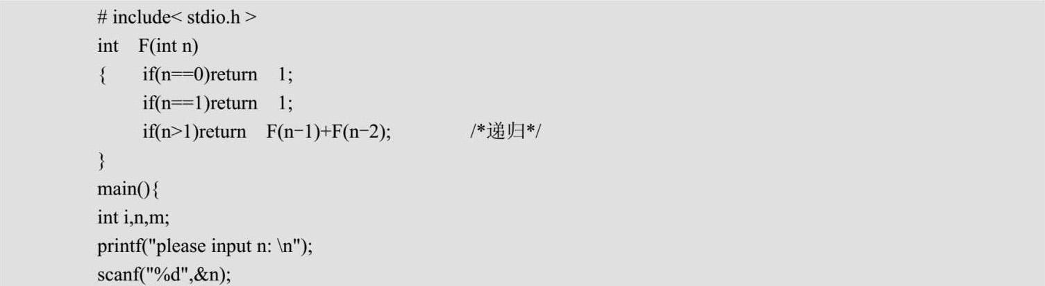 由斐波纳契数列的递归定义可知,当n大于1时,这个数列第n项的数值是它前面两项之和。由于递归算法的执行过程分递推和回归两个阶段,在递推阶段,程序把较复杂的问题(规模为n)的求解推到比原问题简单一些的问题(规模小于n)的求解,在回归阶段,程序由在规模很小时求得的解得到较复杂问题的解。因此,对于斐波纳契数列的求解,要得到数列第n项的值,就必须求得数列第n–1项的值。同理,要求得数列第n–1项的值,就必须求得数列第n–2项的值,依次递推下去,最后需要求得数列第1项和第0项的值,递推部分结束。又当n等于0和1时,其数值为1,根据这些值可求出数列第2项的值,再根据数列第2项的值可得到第3项的值,依次回归,最后可依次得到数列第n–2、n–1和n项的值。由这个例子,我们可以很清楚地了解递归的形式和过程。该问题程序实现如下:
