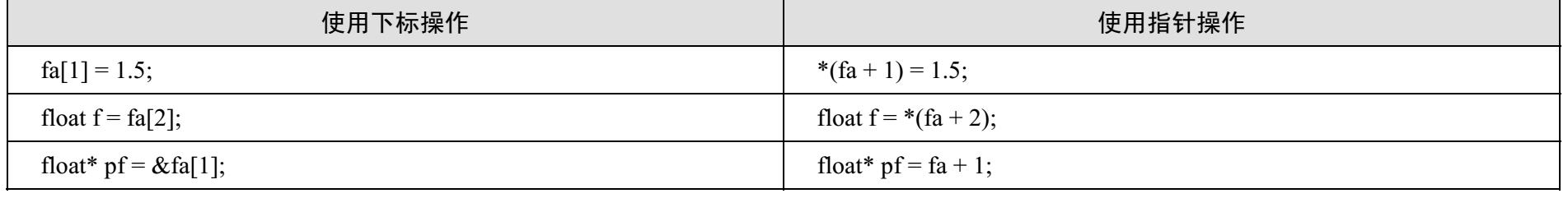 这里声明了一个有3个成员的float类型数组,其中fa[0]=1.0,fa[1]=2.1,fa[2]=3.1。另外,在C语言中,数组和指针的关系非常密切,常可以互换使用。如前面声明的数组fa,可以被看成一个float类型的常数指针(即其指针值不可变),使用指针操作可以达到与下标操作同样的效果,如表2-5中所示的左右两边的操作是等价的。