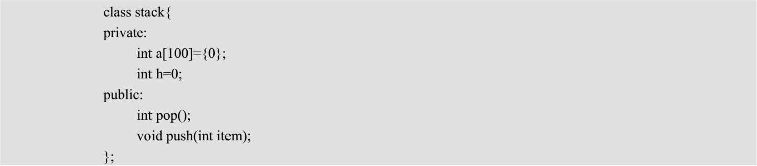 这个声明定义了一个堆栈类,使用数组作为数据的存储方式,h是栈顶的指针,通过pop()和push()进行出栈和压栈的操作。但是该类的用户完全无须了解类内部是如何实现的,只需要知道pop()和push()的语义就可以使用该类型的数据对象了。