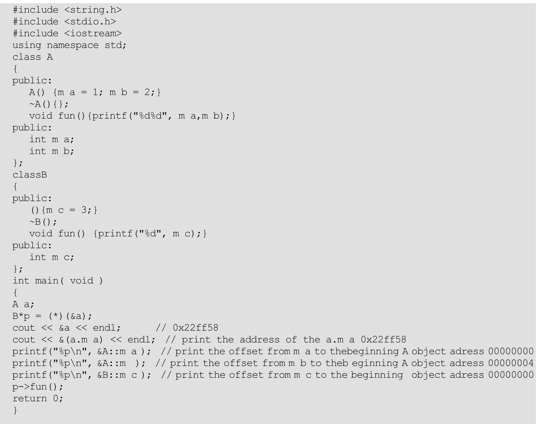 正常情况下,类只有一个元素是int m_c,但是a类的内存空间中存放第一个元素的位置是m_a,p 指向的是对象的内存首地址,比如0x22ff58,当p->func()调用::func()来打印m_c时,编译器对m_c对它的认识就是m_c距离对象的偏移量0,于是打印了对象a首地址的编译量0x22ff58+0 变量值。所以打印的是m_a的值1。以下代码来证明如下: