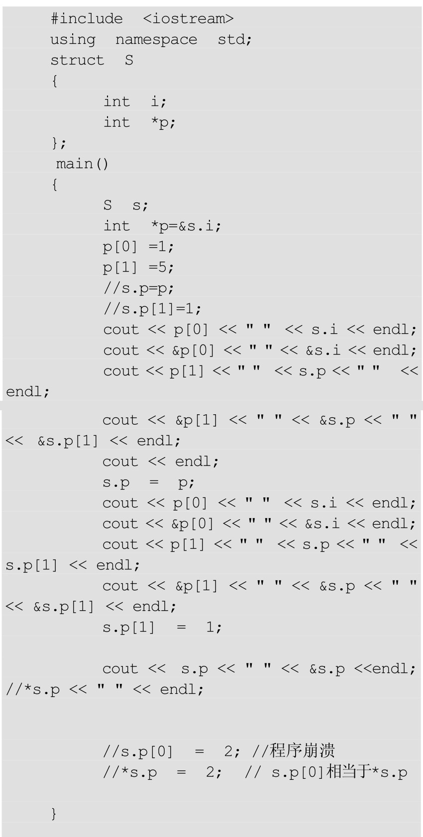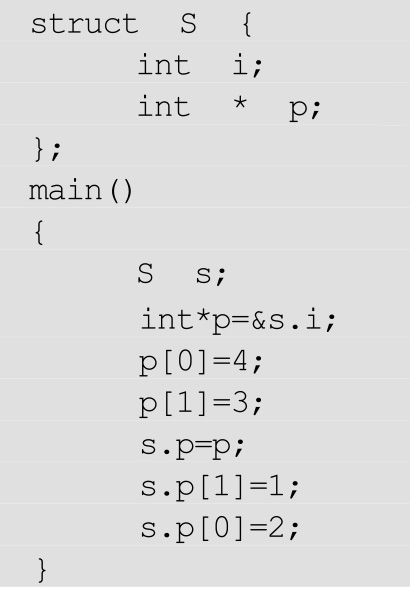 int*p=&s.i;相当于int*p;p=&si;。当执行 p[0]=4;p[1]=3;的时候,p始终等于&si。s.p=p相当于建立了如下关系: