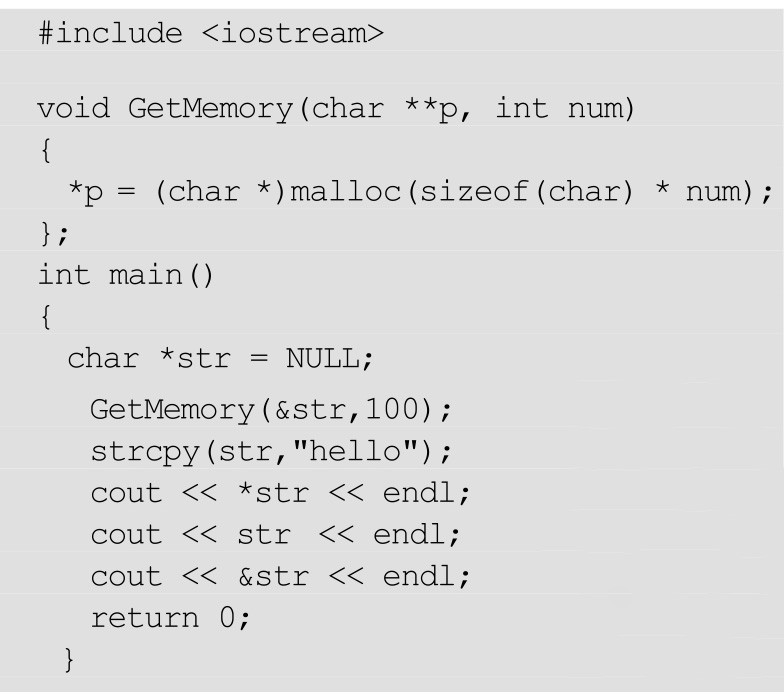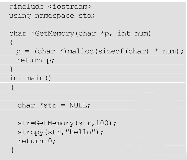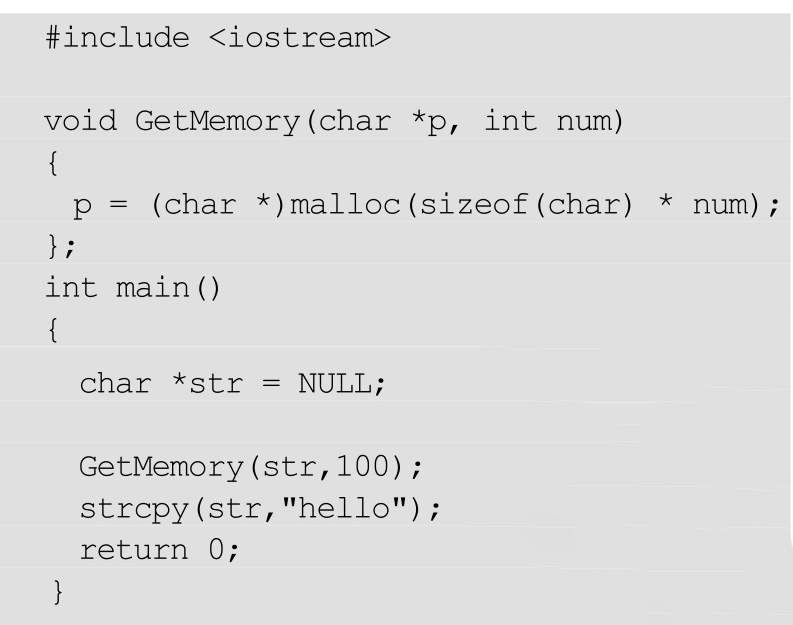 如果一定要用指针参数去申请内存,那么应该采用指向指针的指针,传str的地址给函数GetMemory。代码如下: