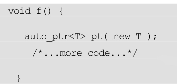 现在,这个代码将不再泄漏T对象,无论是函数正常结束还是因为异常,因为pt的析构函数总在退栈过程中被调用。类似地,auto_ptr可以被用来安全地包容指针: