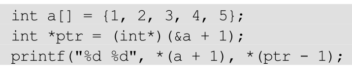 第二个的确是5。首先a表示一个1行5列数组,在内存中表示为一个5个元素的序列。int*ptr=(int*)(&a+1)的意思是,指向a数组的第6个元素(尽管这个元素不存在)。那么显然,(ptr-1)所指向的数据就是a数组的第5个元素——5。