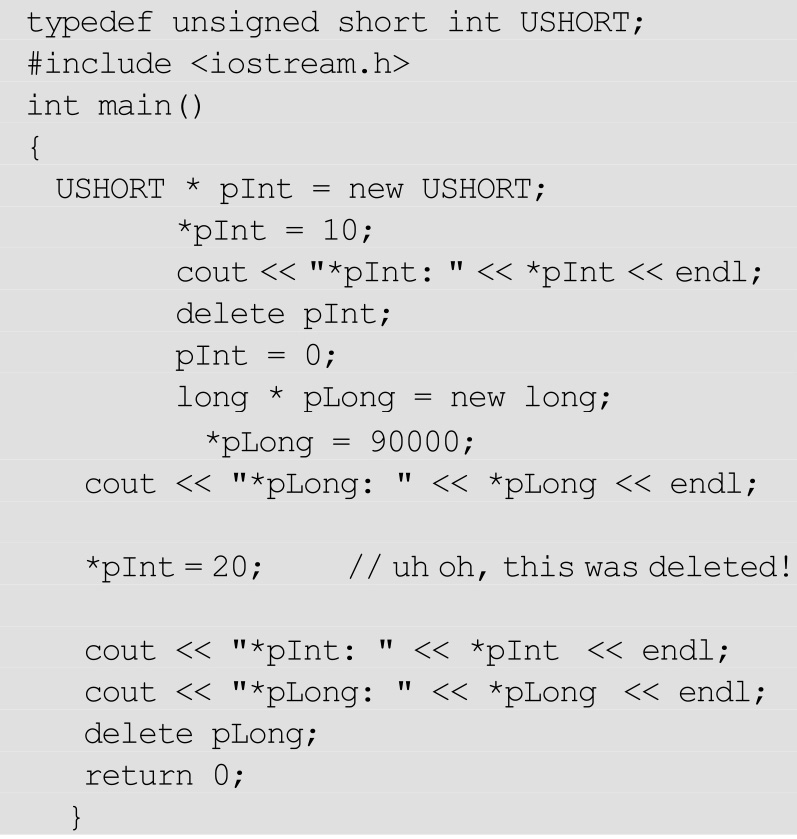 总之,在删除指针后小心不要再使用它。虽然这个指针仍然指向原来的内存区域,但是编译器已经把这块内存区域分配给了其他的数据。再次使用这个指针会导致你的程序崩溃。更糟糕的情况是,程序可能表面上运行得很好,过不了几分钟就崩溃了。这被称为定时炸弹,可不是开玩笑。为了安全起见,在删除一个指针后,把它设置为空指针(0)。这样就可以消除它的危害。