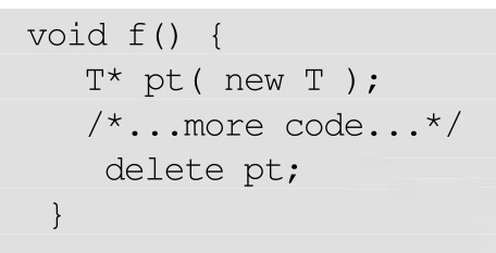 如果f()从没有执行delete语句(因为过早的return或者是在函数体内部抛出了异常),动态分配的对象将没有被delete,一个典型的内存泄漏。使其安全的一个简单方法是用一个“灵巧”的类指针对象包容这个指针,在其析构时自动删除此指针: