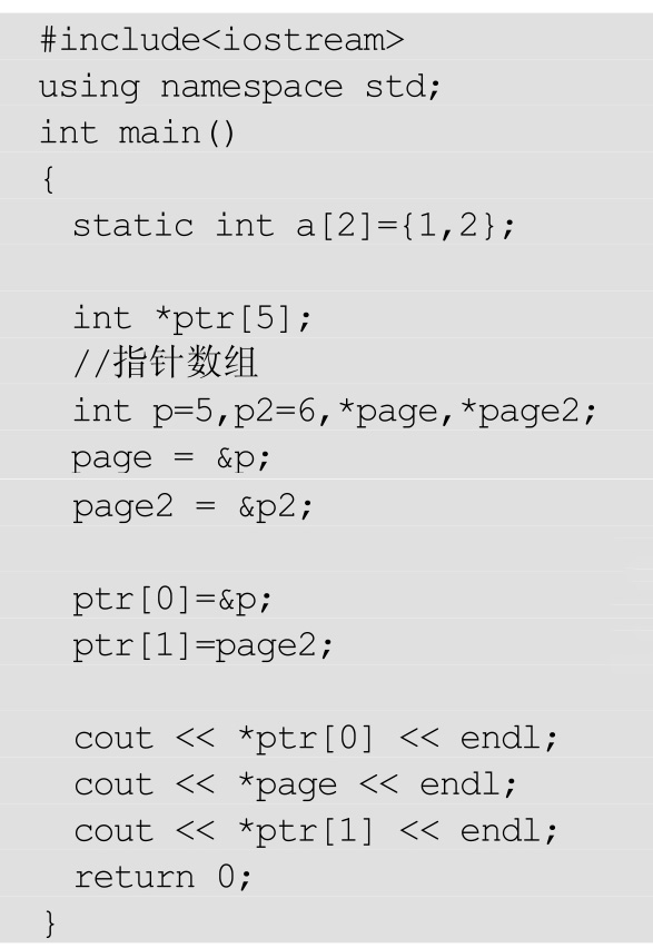 int*ptr[]是指针数组,ptr[]里面存的是地址。它指向位置的值就是*ptr[0]、*ptr[1]、*ptr[2]、*ptr[3]。不要存*ptr[0]=5;、*ptr[1]=6;,因为这里面没有相应的地址。