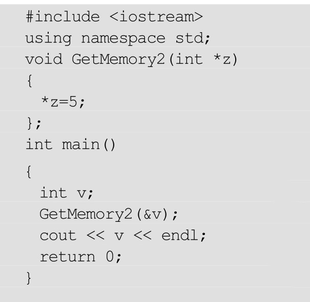 GetMemory2把v的地址传了进来,*z是地址里的值,是v的副本。通过直接修改地址里的值,不需要有返回值,也把v给修改了,因为v所指向地址的值发生了改变。