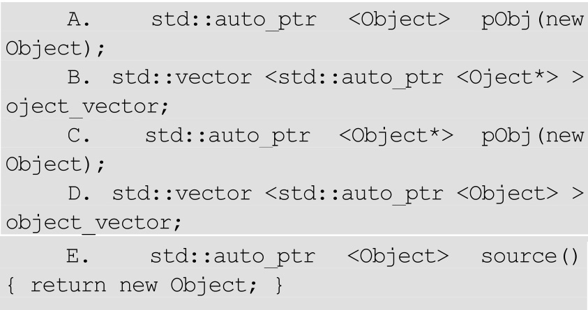 面试例题2 :In C++,which of the following are valid uses of the std::auto_ptr template considering the class definition below?(下面关于智能指针auto_ptr用法正确的是哪项?)[美国软件公司M2009年12月笔试题]