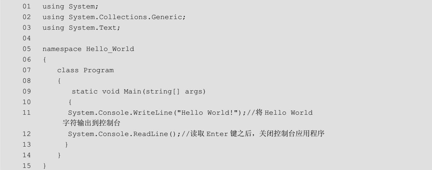 双击Program.cs文件,打开该代码文件,在Main()函数的程序代码中输出“HelloWorld”字符串,Program.cs文件代码如下。