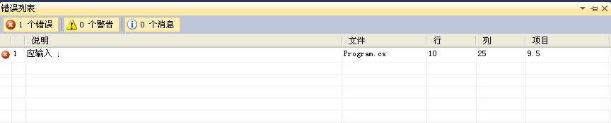 如果在程序的编译过程中出现了语法错误,Visual Studio 2010会自动提示错误的原因。上一实例代码中,如果把第一条“HelloWorld”输出语句后的分号去掉,然后进行编译,Visual Studio 2010会提示如图1-16的错误。单击“否”按钮,Visual Studio 2010会在窗口显示具体的错误提示信息,如图1-17所示。
