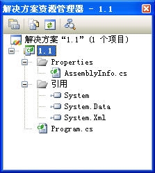 创建完毕之后,Visual Studio 2010会自动在“解决方案浏览器”中显示整个解决方案和项目的文件。在“解决方案浏览器”的文件结构中,可以看到已经创建好的一个Program.cs文件。在该文件中,可以编写控制台应用程序的主函数代码。“解决方案浏览器”窗口如图1-14所示。