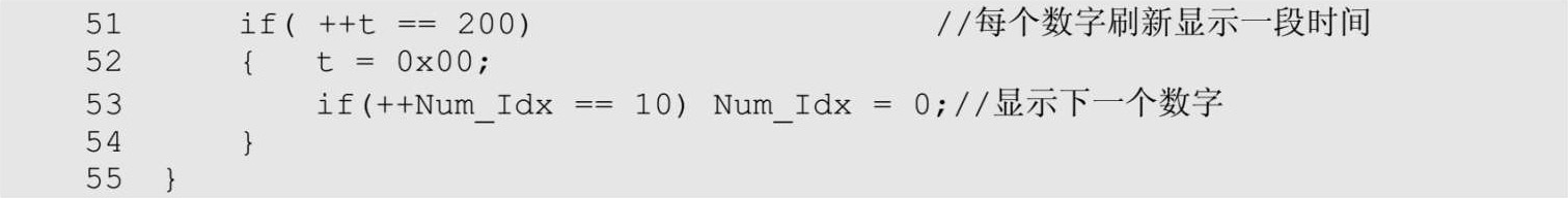 变量Num_Idx标识了将要显示的数字,取值范围为0~9,变量i的取值范围为0~7,表达式~DotMatrix [Num_Idx * 8 + i]使程序取得第Num_Idx个数字的第i字节。因为每个数字的点阵编码由8字节构成,每次取得0~7字节中的1字节,通过P2端口发送到点阵屏的行引脚上,在发送行码之前,P3端口先发送相应的列码选通对应列。由语句P3 = 1<<i可以看出,在本例点阵屏的连接方式下,各列中的LED是共阳的,1<<i总是使第i列变为高电平,其他列为低电平,这时发送的行码将仅仅显示在第i列,这类似于当前发送给8位集成式数码管中的段码将仅仅显示在第i位上。