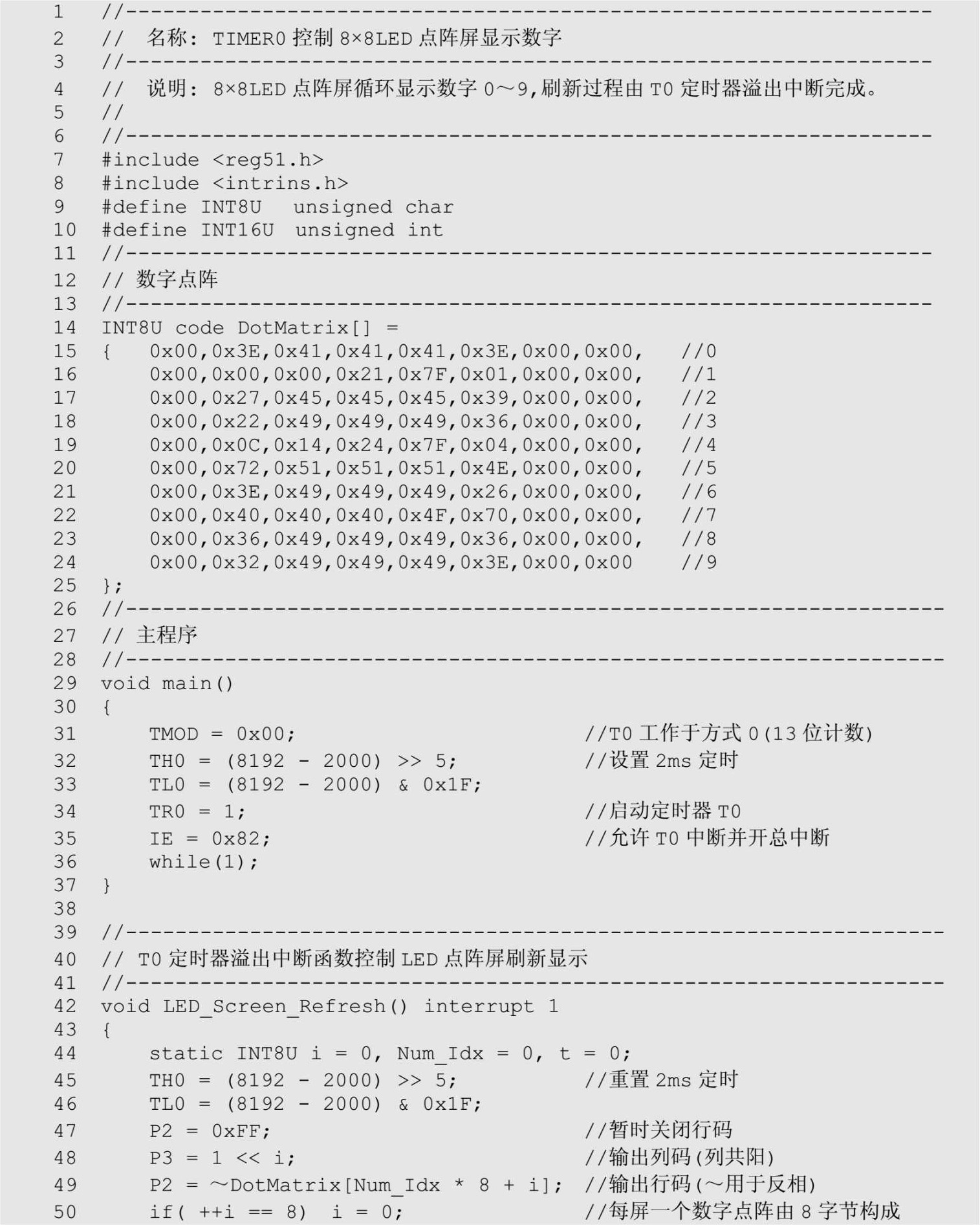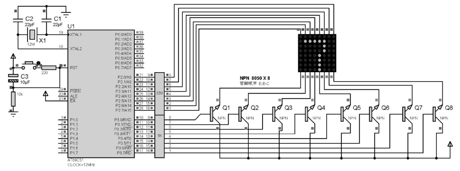 图3-18所示电路中用8只NPN三极管8050驱动LED点阵屏的列码,行码则由P2端口输出,程序运行时,8×8 LED点阵屏依次循环显示数字0~9,刷新过程由T0定时器控制完成。