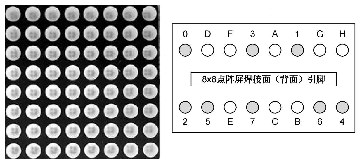 图3-19给出了8×8LED点阵屏正面视图及焊接面(背面)引脚。