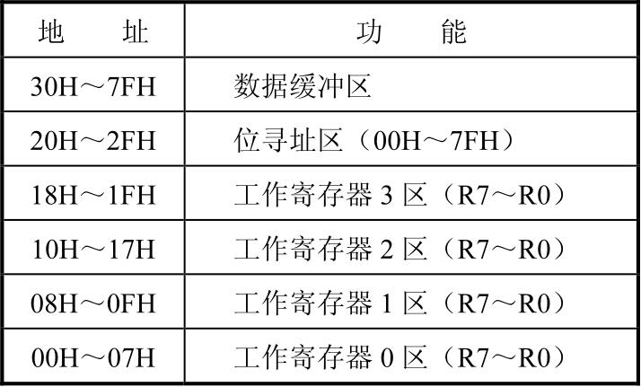 低128单元是单片机的真正RAM存储器,按其用途划分为寄存器区、位寻址区和用户RAM区等3个区域。单元的配置见表2-2所示。