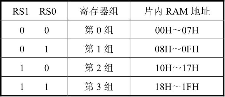 ·RS1 和 RS0(PSW.4,PSW.3):寄存器组选择位。可用软件置位或清零,用于CPU选择当前使用的是哪一组通用寄存器组。但当单片机上电或复位后,RS1和RS0均为0。通用寄存器共有4组,其对应关系如表2-5所示。
