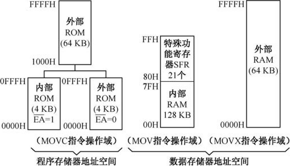 ①对于8051,它的片内ROM地址为0000H至0FFFH(4KB),它的片外ROM最大容量可为0000H至FFFFH。片内与片外ROM在低4KB地址出现重叠,这种重叠的区分由8051的引脚EA进行控制。