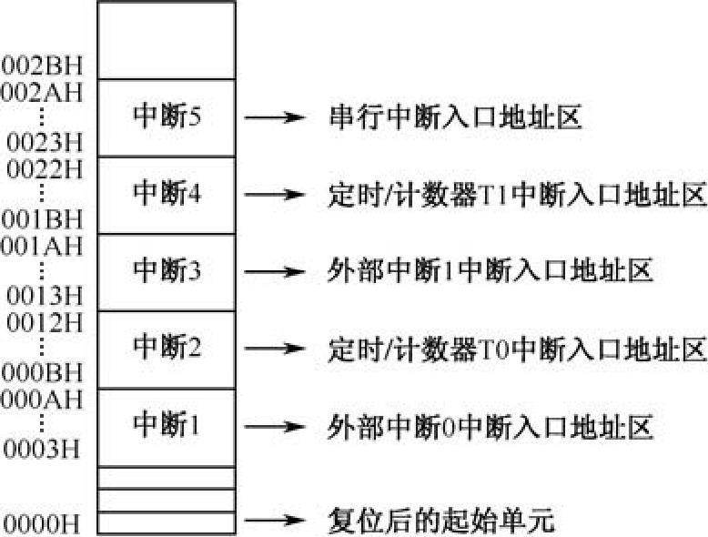0003H~002AH是一组特殊单元,共40个单元。这40个单元被均匀地分为5段,作为5个中断源的中断入口地址区,如图2-4所示。