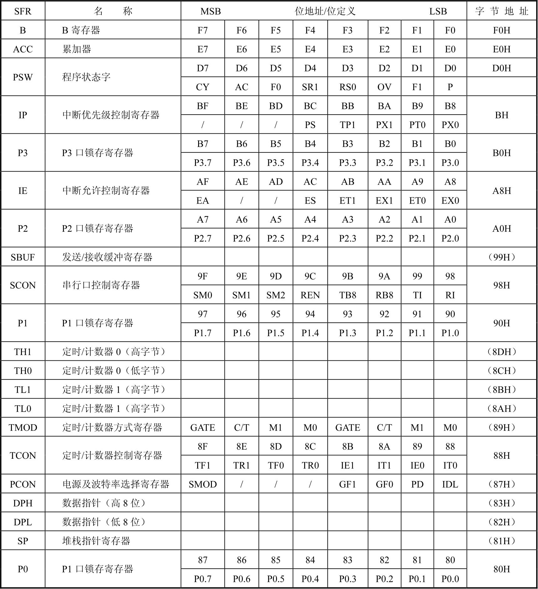 表2-4 MCS-51专用寄存器地址表