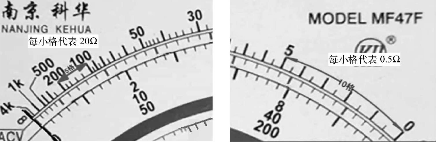 指针式万用表的欧姆挡的刻度线是不均匀的,并且是倒刻度线,右边为0,刻度稀,每小格代表的欧姆值小;左边为∞,刻度密,每小格代表的欧姆值大,如图1-34所示。