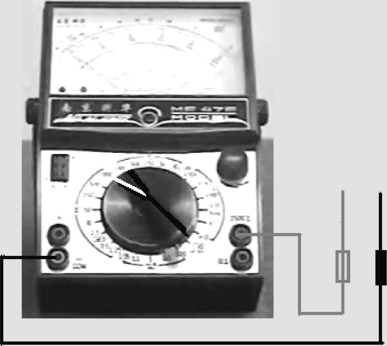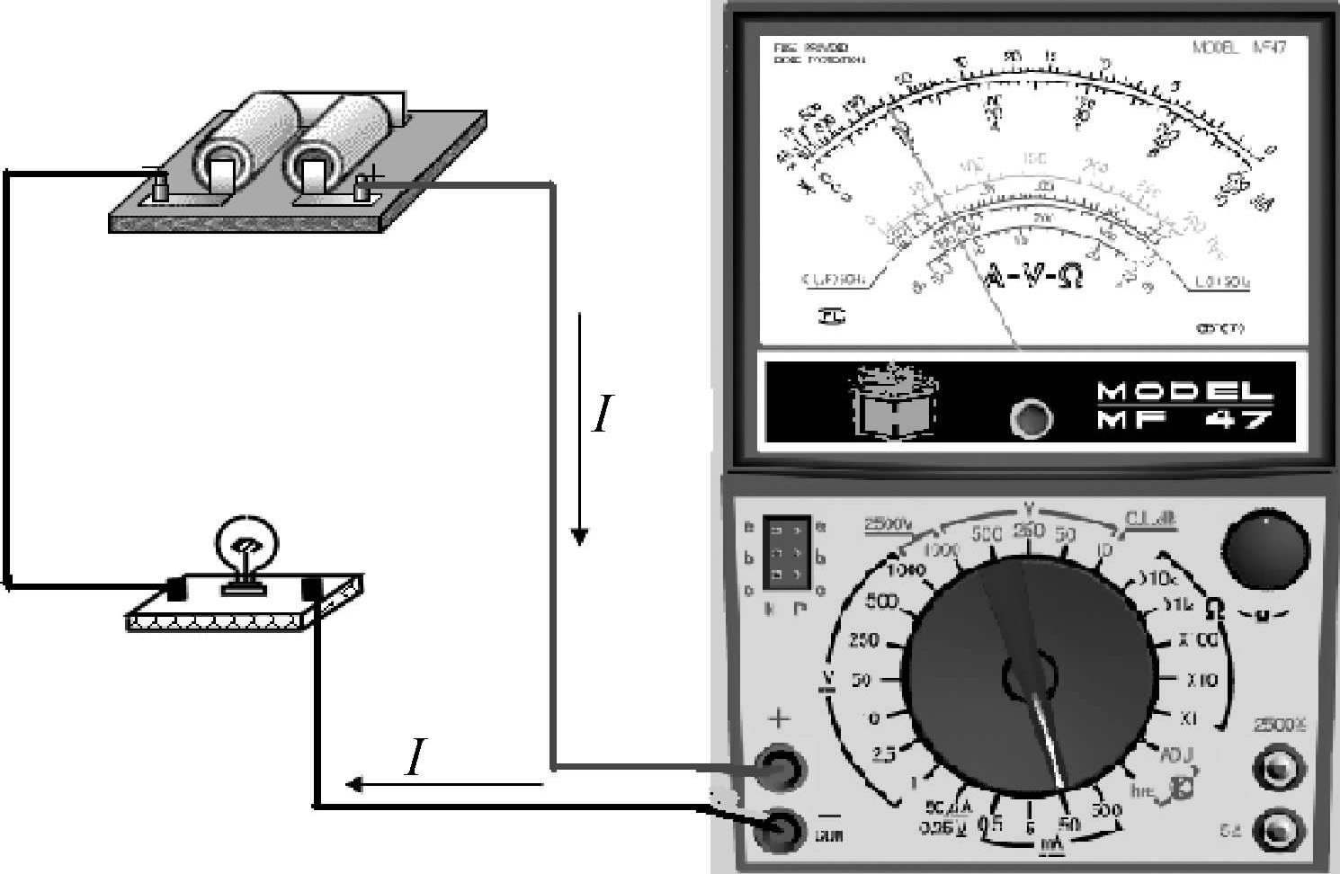图1-43 MF47型万用表测大电流的挡位选择及表笔接法