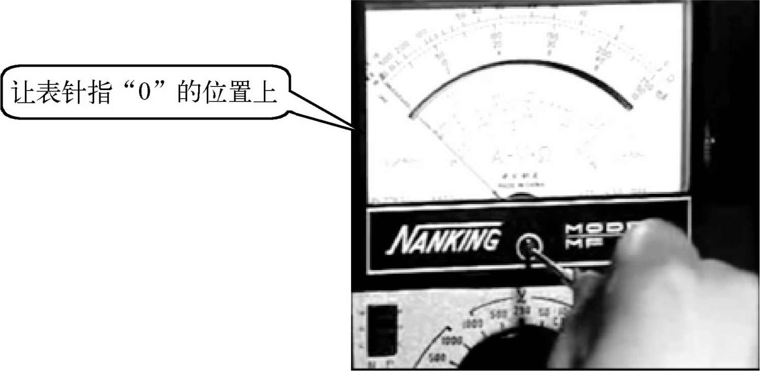 方法是:将红、黑两支表笔短接,同时旋转“欧姆调零旋钮”,让指针刚好指在欧姆刻度线右边的零位。并且每换一次倍率挡,都要再次进行欧姆调零,如图1-31所示,以保证测量准确。如果指针不能调到零位,说明电池电压不足或仪表内部有问题。