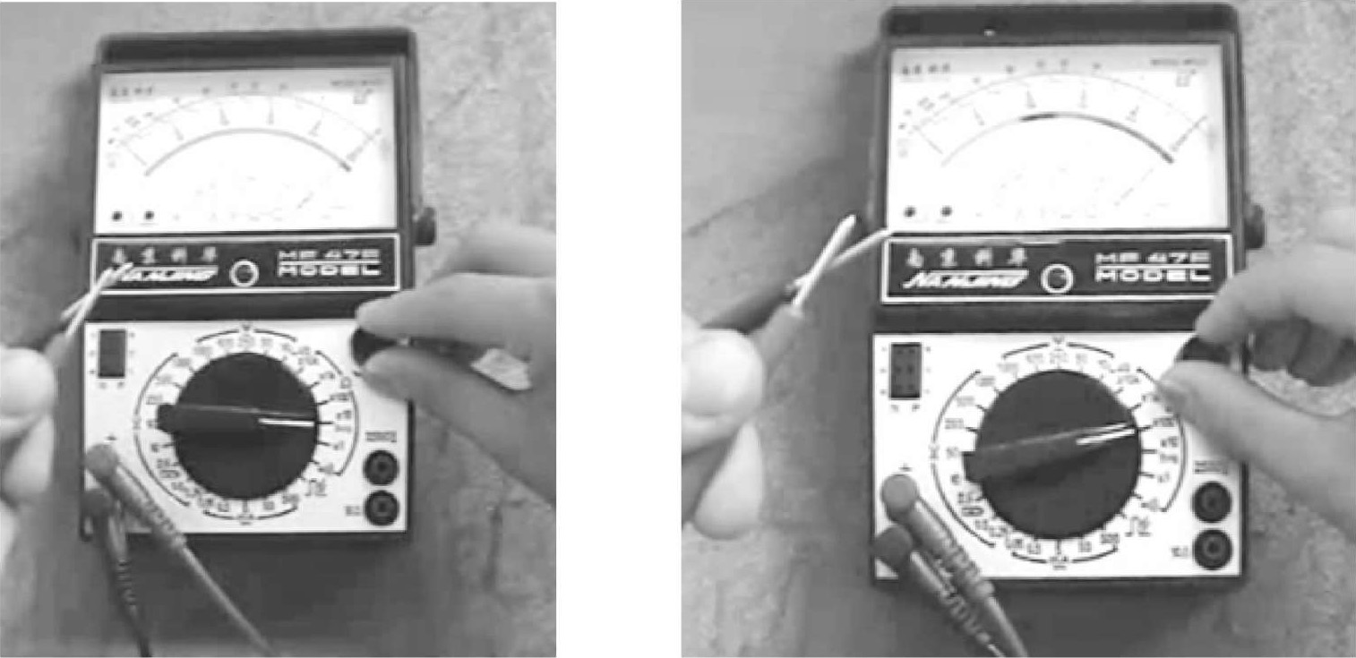 (2)如果事先不知道被测点电位的高低,可将任意一支表笔先接触被测电路或元器件的任意一端,另一支表笔轻轻地试触一下另一被测端,若表头指针向右偏转(正偏),说明表笔正负极性接法正确,可以继续测量,如图1-39所示;若表头指针向左偏转(反偏),说明表笔极性接反了,交换表笔后可以测量。